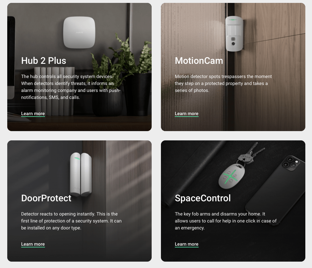 StarterKit Cam Plus is the core of a multi-level security system. Hub 2 Plus can manage 200 devices: motion detectors with photo verification of events and sirens, fire and leak detectors, automation relays, even integration modules with wired devices.