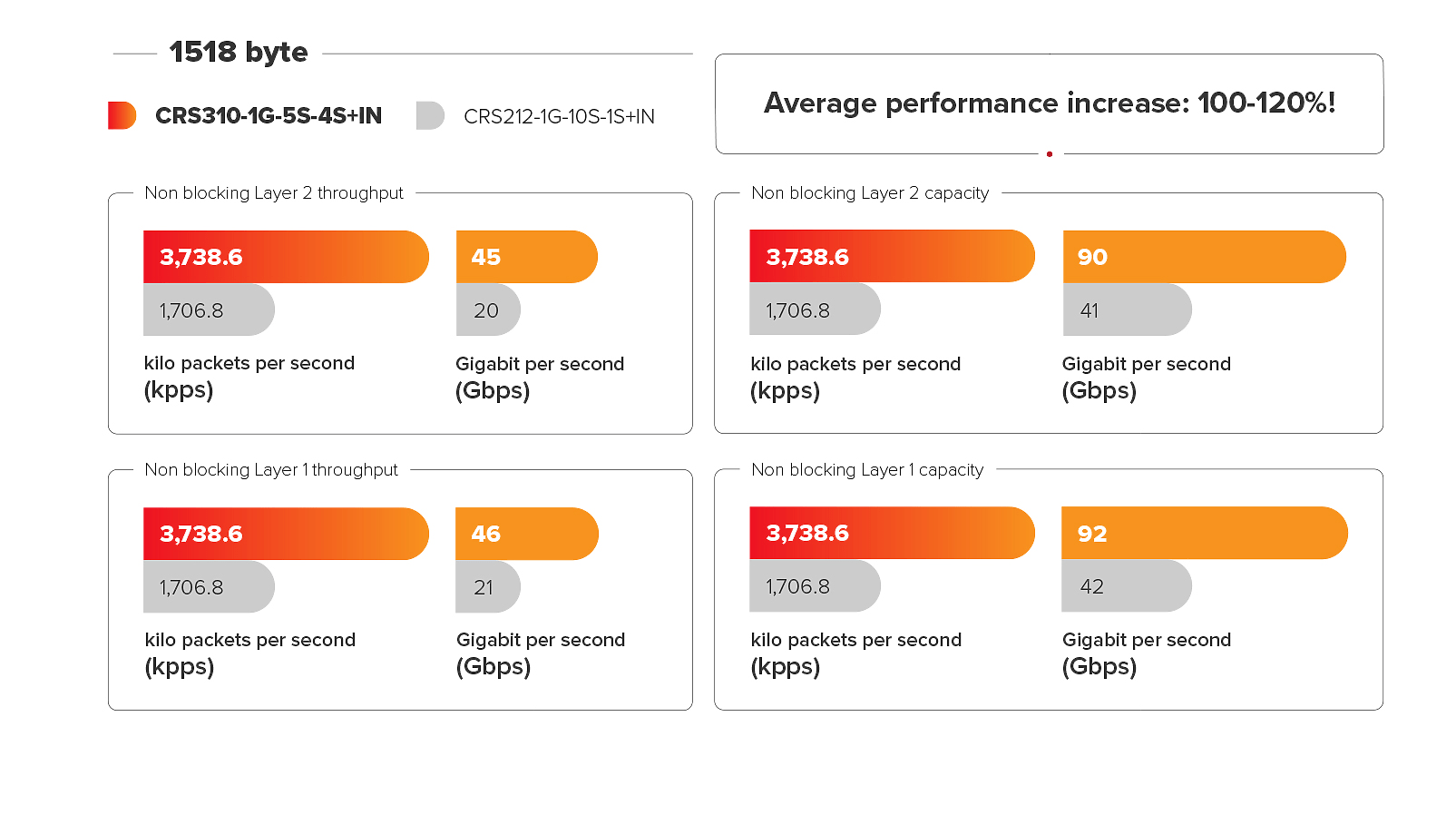 You can mount this switch in a standard 1U rack to keep everything organized. And it has all the power you would expect from a rackmount device: CRS310 supports hardware offloaded VLAN- filtering. And even some hardware offloaded Layer-3 routing.