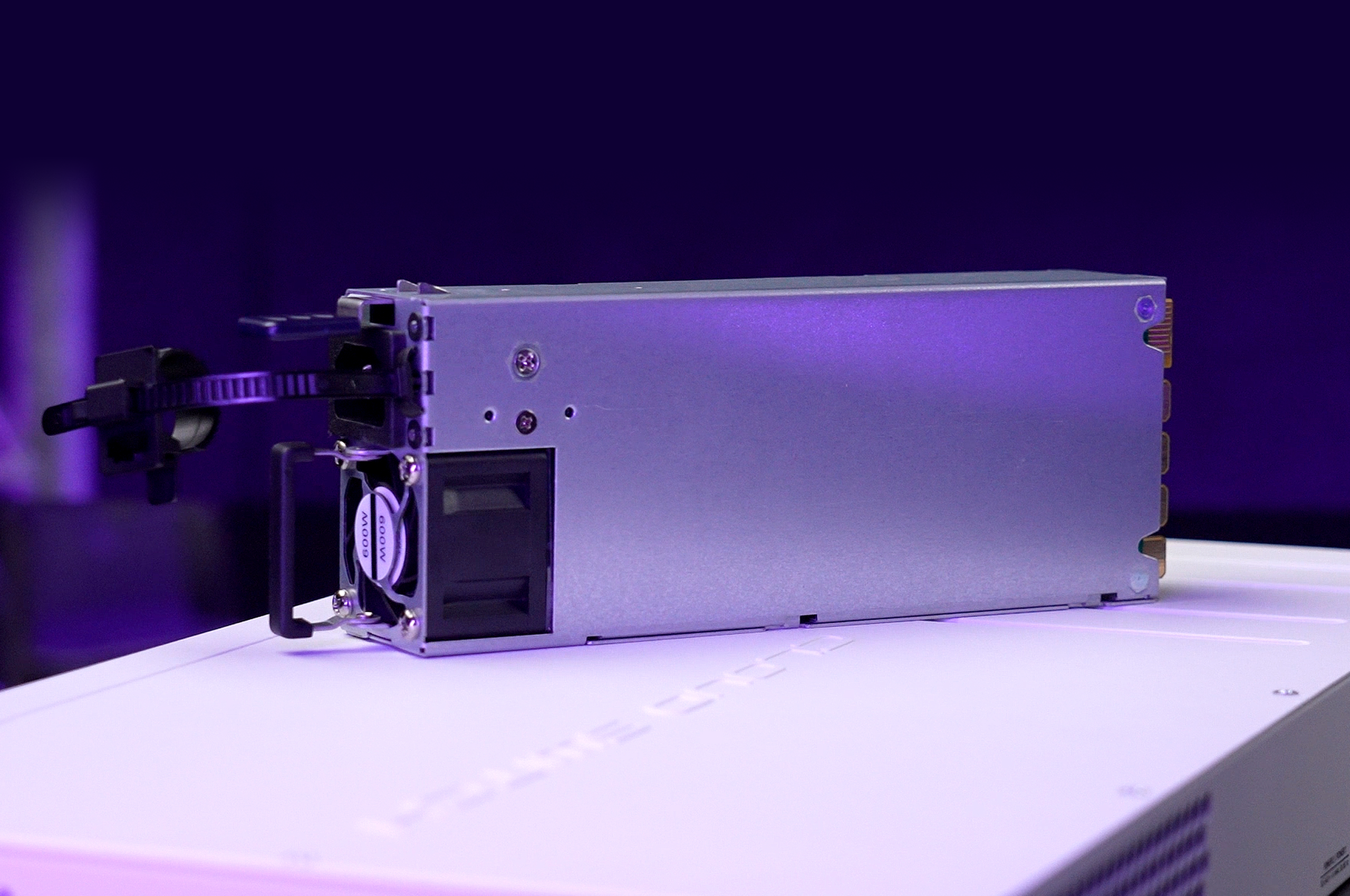 Hot-swap 54.5V 10.35A 600W power supply for the CRS320-8P-8B-4S+RM PoE++ switch. The switch comes with a single 600W PSU and an expansion slot for a second PSU that can raise the total power output all the way to 1150 Watts, up to 90 Watts per PoE++ port.