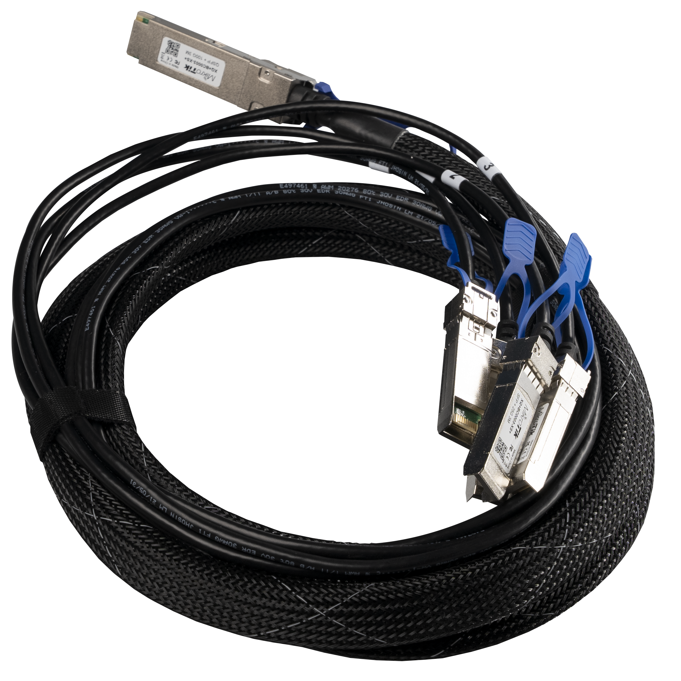 XQ+BC0003-XS+ is a QSFP28 to 4x SFP28 break-out cable. This addition to the MikroTik 100 Gigabit product line allows you to connect multiple 25 Gigabit devices to your CRS504 or CCR2216. With the integrated SFP28 modules, connecting numerous devices becomes as simple as it gets. The cable is 3 meters long – the perfect length to reach all the necessary spots while keeping your server room neat and tidy.