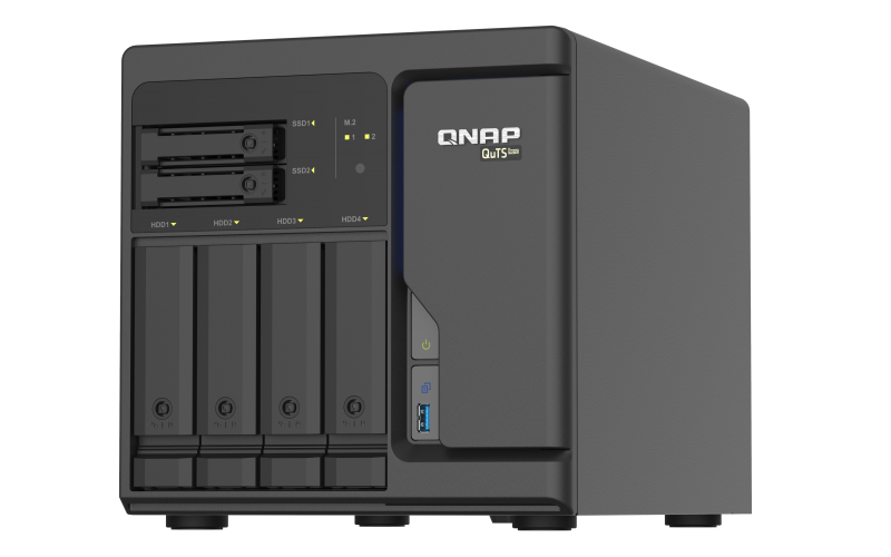 Intel® Xeon® D desktop QuTS hero NAS with four 2.5GbE ports, designed for real-time SnapSync data backup and virtual machine applications