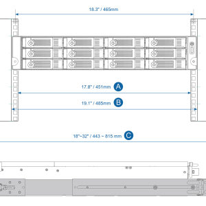 This rail kit is designed for racks with 25-inch mounting depth. You may need to reserve some space when installing and adjusting the rail kit for racks with 18-inch mounting depth. Rack size: Mounting post width: ≥ 17.8″/451mm. Panel width: ≥ 19.1″/485mm. Mounting post depth: 18″ ~ 32″/443mm~815m