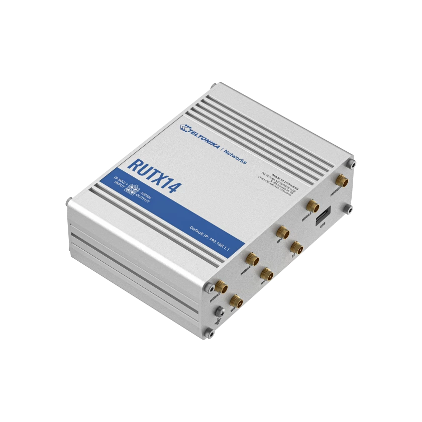 RUTX14 is the fastest single modem LTE-A Cat 12 router in the Teltonika Networks product range. With two SIM cards, Wave-2 dual-band Wi-Fi, five Gigabit Ethernet ports, and automatic failover, you may expect high compatibility, unbeatable network resilience, and exceptional speed.