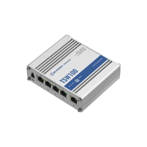 TSW100 is an unmanaged Gigabit Ethernet switch supporting Power-over-Ethernet. Classified as power source equipment (PSE), it centralizes the power supply, providing up to 30 watts per port and reducing installation effort. Five Gigabit Ethernet ports provide an economical high-bandwidth solution for a secure industrial Ethernet network.
