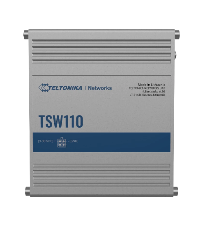 TSW110 is an unmanaged layer 2 switch. This tiny but rugged professional device enables industrial high-bandwidth applications with a reliable data connection. It has five Gigabit Ethernet ports to connect equipment to the network and supports wide power supply voltages (9-30 V).