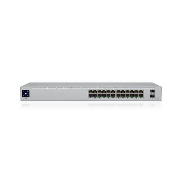 The Switch 24 (USW 24) is a fully managed, fanless switch with (24) GbE RJ45 ports and (2) 1G SFP ports. The versatile USW 24 provides Gigabit links to Ethernet devices while also supplying Gigabit fiber uplink options fit for an enterprise network. The switch also offers an extensive suite of Layer 2 switching protocols, including port-specific operation modes (switching, mirroring, or aggregate), and features a 1.3″ LCM color touchscreen that concisely displays key system and connection insights. This switch can also be monitored or configured from anywhere with the powerful, intuitive UniFi Network web application and mobile app.