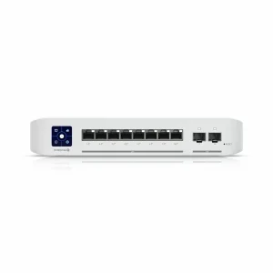 The UniFi Switch Enterprise 8 PoE has automatic 802.3at PoE+ detection on all 8 RJ45 ports, as well as two 10 Gbps SFP+ trunk ports for connecting to WiFi 6 access points and fiber links. A 1.3″ LCD touch screen display shows the current status and operating mode of the switch. It can be used to make adjustments to the switch parameters and view some statistical information without the need for a graphical interface.
