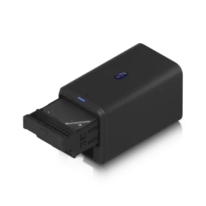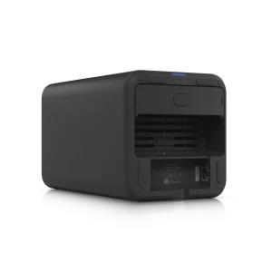 UniFi Network Attached Storage with (2) 3.5″ HDD bays, 2.5 GbE networking, USB-C connectivity, and an included PoE++ adapter, all in a compact footprint.